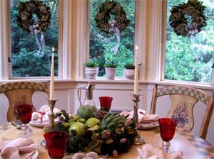Want something really easy and environmentally chic? Grab some fruit and vegetables! Toss your artichokes or apples in the center of a holiday wreath placed on your table, or fill an apothecary jar with red and green apples for an instant organic display. That’s it! Having a centerpiece you can eat is VERY Martha. She is always multi-tasking.